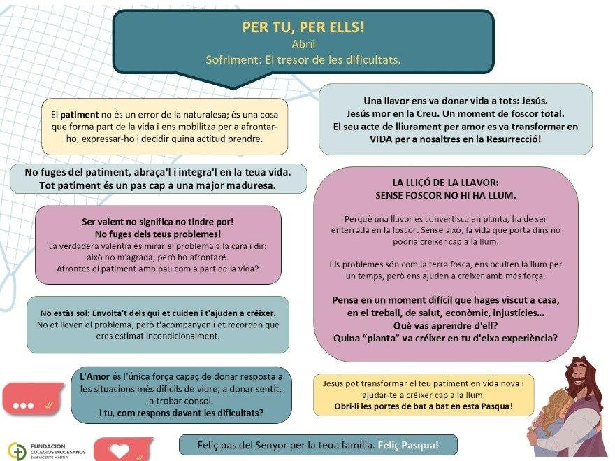 Trabajamos la pastoral conjuntamente con 67 colegios de la Fundación San Vicente Mártir (red de los Colegios Diocesanos de Valencia), gracias al Programa de Acción Tutorial (PAT) que nos permite desarrollar un trabajo diario con los alumnos.